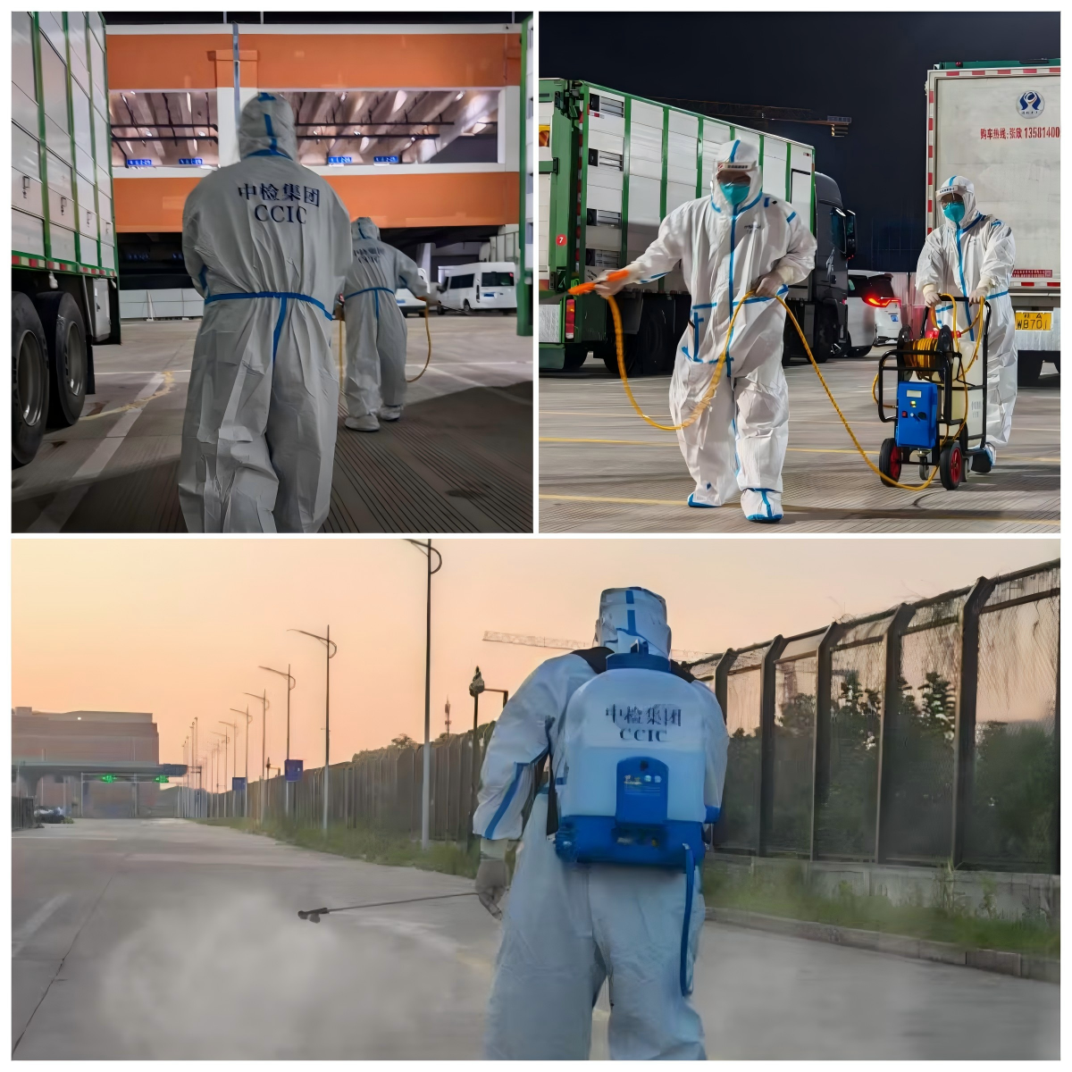 在作业现场,工作人员身着专业防护服、手持喷雾器,在航空器与转运场地间对运输车辆轮胎进行反复消毒,使用专用工具向装载箱缝隙精准喷洒药剂,确保每个操作环节均严格对标检疫标准。经过4小时连续奋战,团队圆满完成全流程检疫处理,累计消毒面积超一万平方米。