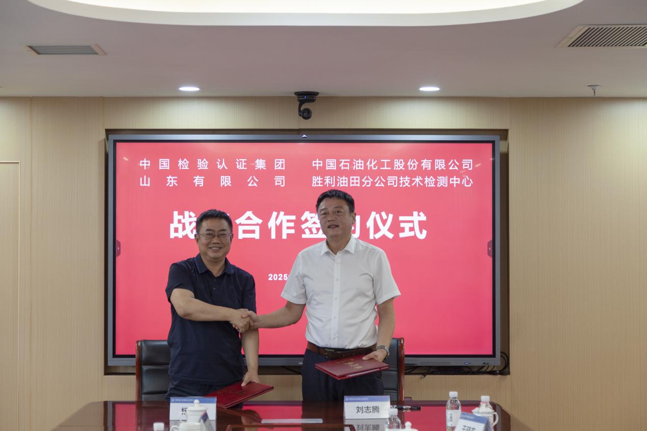 近日,中国中检山东公司与中国石油化工股份有限公司胜利油田分公司技术检测中心(简称“胜利油田技术检测中心”)在青岛签署战略合作协议。