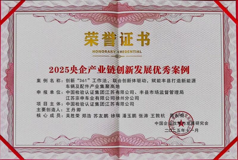 中国中检江苏公司围绕江苏丰县新能源车辆及配件产业发展需求,通过创建“361”工作法(一套工作规范、三大工作策略、六个提升方向),构建“四位一体”质量联合创新体,系统性打造了“链长引领、产业联动、协同提升”的产业链质量管理模式,绘制了产业链质量图,树立了质量提升新标杆,全面推进丰县特色产业链质量管理水平提升。