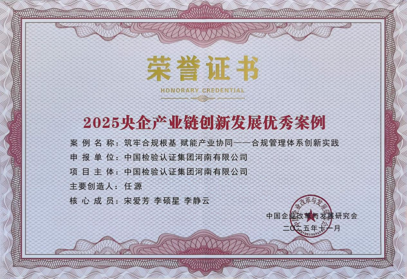 中国中检河南公司以“赋能地方产业合规升级”为核心目标,聚焦河南省重点产业,以“政策落地+需求匹配”为导向,构建“央企引领、多方协同、全链覆盖”的合规服务生态,为地方企业提供定制化合规管理体系贯标认证服务,为区域产业链合规治理能力提升提供坚实支撑。