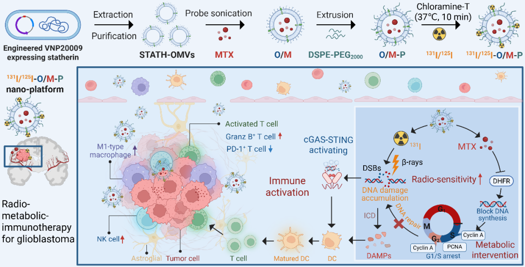 针对脑胶质瘤高侵袭性、易复发和免疫抑制微环境等治疗难点,研究团队创新设计出一种基于工程化细菌外膜囊泡的多功能纳米载药系统,实现了放射性核素碘-131与化疗药物甲氨蝶呤的精准共载与时序控释,通过“放射损伤→代谢阻断→免疫激活”的级联机制,同步克服了肿瘤放疗抵抗与免疫抑制两大瓶颈。实验数据表明,这一成果不仅为脑胶质瘤的综合治疗提供了新范式,其“生物源载体+时序功能编程”的方法论,也为阿尔茨海默病靶向递药、术后抗复发疫苗等神经与免疫交叉领域的技术迁移开辟了新路径。