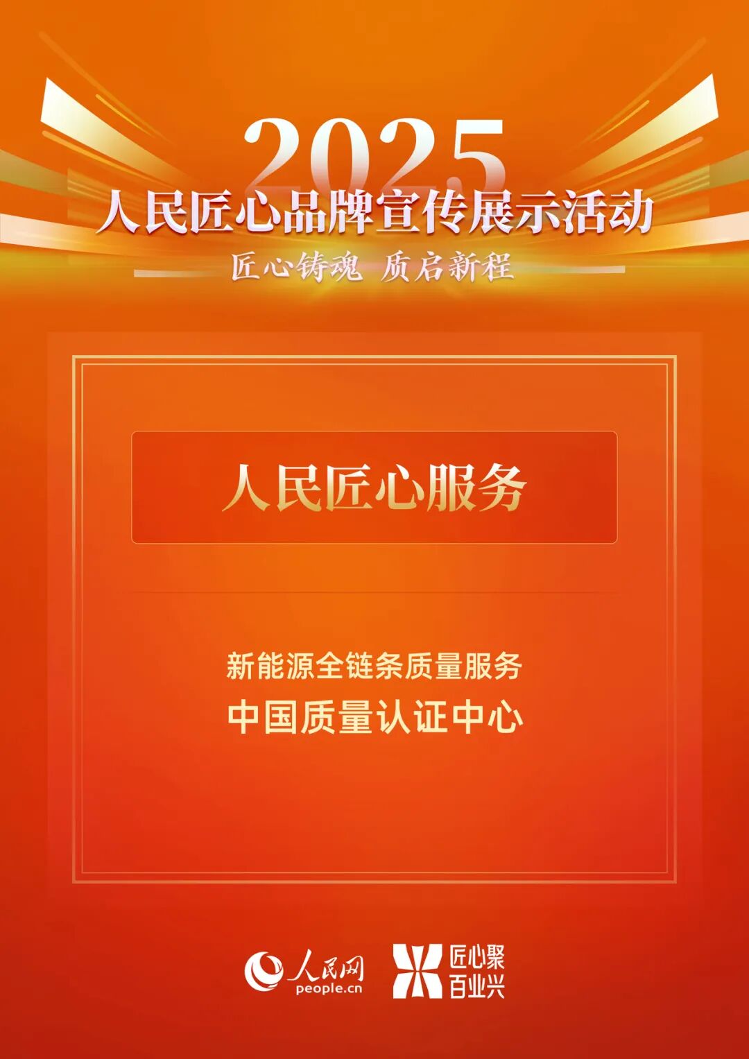 会议揭晓了2025年度“人民匠心品牌”。中国质量认证中心凭借在新能源领域的优秀全链条质量服务,入选“人民匠心品牌-匠心服务”案例。作为国内领先的综合性质量服务机构,中国质量认证中心专注于提供“国际化、高端化、绿色化、数智化”的合格评定方案,以匠心服务质量强国建设,推动全球质量提升、品牌创造。