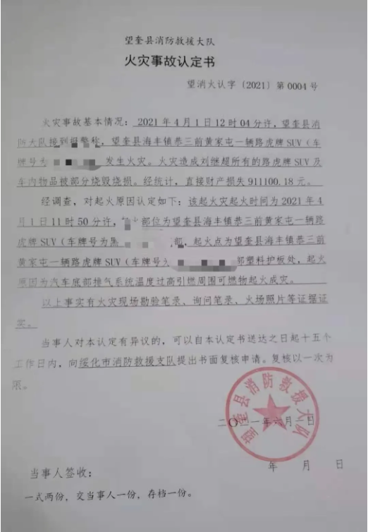 主持人欣莉:记者也看到了望奎县消防救援大队出具的火灾事故认定书,这份认定书是今年6月1号出具的,报告当中写到:“起火事件为2021年4月1日11时50分许,起火部位为路虎SUV底部,起火原因为汽车底部排气系统温度过高引燃周围可燃物起火成灾。”对此欣莉律师团法律顾问佟建磊律师发表了意见。