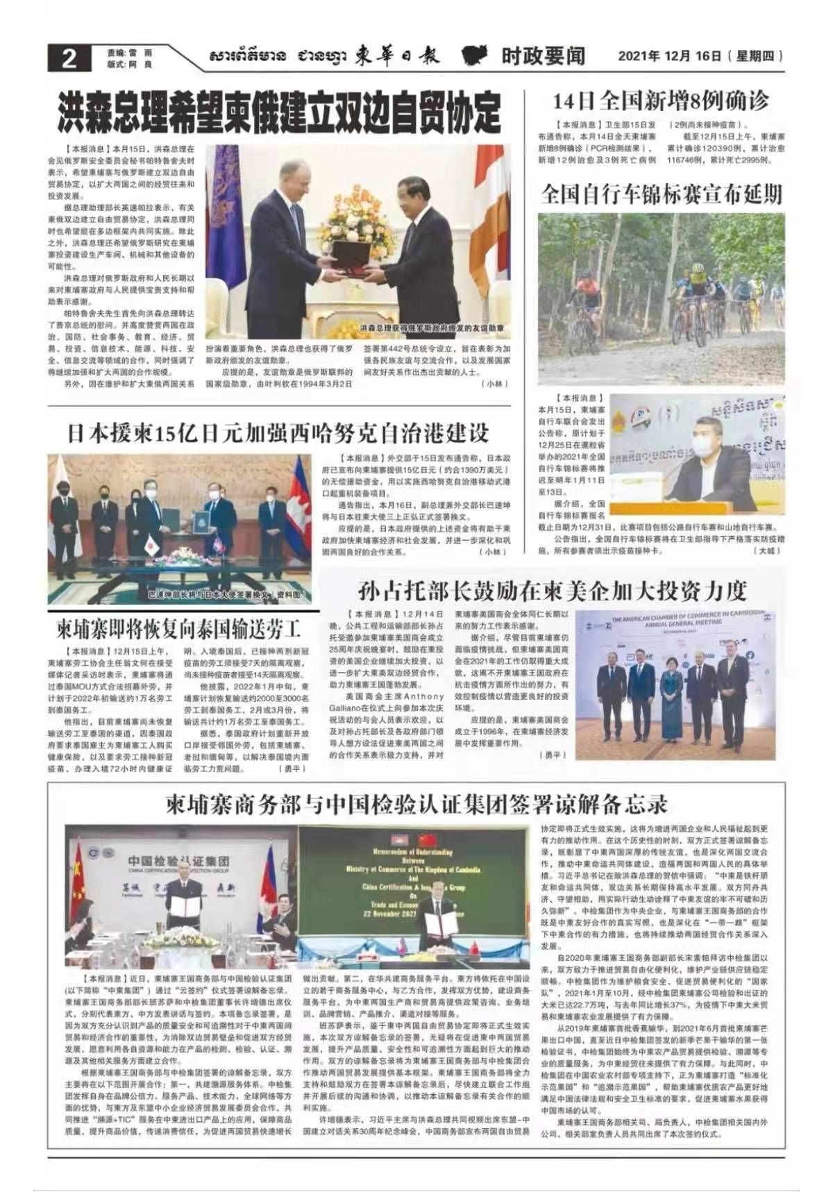 许增德表示,习近平主席与洪森总理共同视频出席东盟-中国建立对话关系30周年纪念峰会,中国商务部宣布两国自由贸易协定即将正式生效实施,这将为增进两国企业和人民福祉起到更有力的推动作用。在这个历史性的时刻,双方正式签署谅解备忘录,既彰显了中柬两国深厚的传统友谊,也是深化两国交流合作,推动中柬命运共同体建设,造福两国和两国人民的具体举措。习近平总书记在致洪森总理的贺信中强调:“中柬是铁杆朋友和命运共同体,双边关系长期保持高水平发展。双方同舟共济、守望相助,用实际行动生动诠释了中柬友谊的牢不可破和历久弥新”。中检集团作为中央企业,与柬埔寨王国商务部的合作既是中柬友好合作的真实写照,也是深化在“一带一路”框架下中柬合作的有力措施,也将持续推动两国经贸合作关系深入发展。