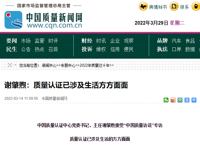 中国质量新闻网讯 在“3·15”来临之际,中国质量认证中心党委书记、主任谢肇煦做客中国质量新闻网,接受“中国质量访谈”专访。谢肇煦就“质量认证对消费者生活的影响”“质量认证还是CQC在新兴产业布局”以及“质量认证如何帮助中国企业走出去”等问题进行交流。他表示,质量认证已涉及生活的方方面面,中国质量认证中心(CQC)以后将继续秉承 “认证为民,品质共享”的社会责任理念,为社会发展作贡献。
