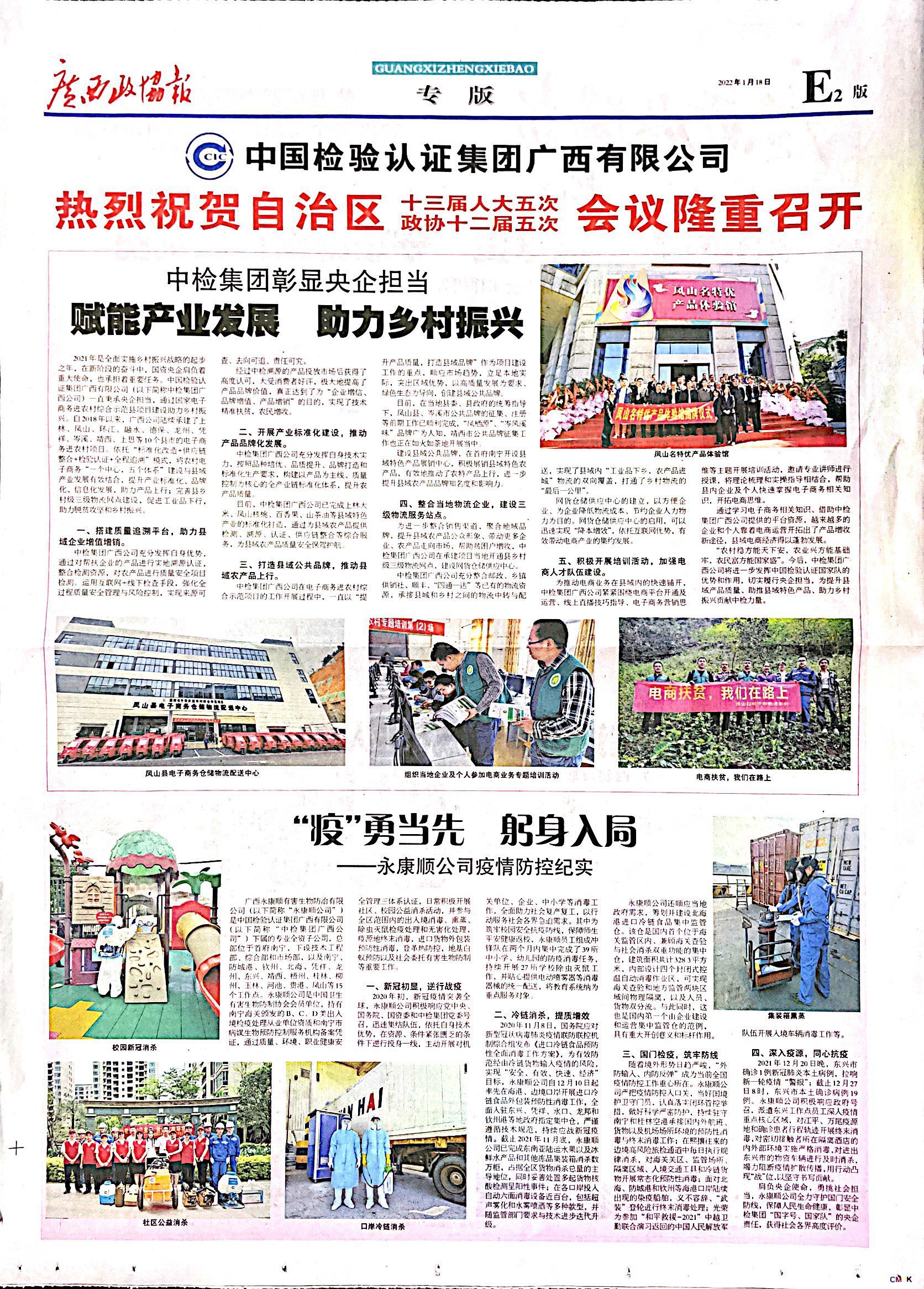 2020年11月8日,国务院应对新型冠状病毒肺炎疫情联防联控机制综合组发布《进口冷链食品预防性全面消毒工作方案》,为有效防范经由冷链货物输入疫情的风险,实现“安全、有效、快速、经济”目标,永康顺公司自12月10日起率先在海港、边境口岸开展进口冷链食品外包装预防性消毒工作,全面入驻东兴、凭祥、水口、龙邦和钦州港等地政府指定集中仓,严谨遵循技术规范,持续应战新冠疫情。截止2021年11月底,永康顺公司已完成东南亚陆运水果以及冰鲜水产品和其他冻品集装箱消杀数万柜,占据全区货物消杀总量的主导地位,同时妥善处置多起货物核酸检测呈阳性事件;在各口岸投入自动六面消毒设备近百台,包括超声雾化和水雾喷洒等多种款型,并随监管部门要求与技术进步迭代升级。