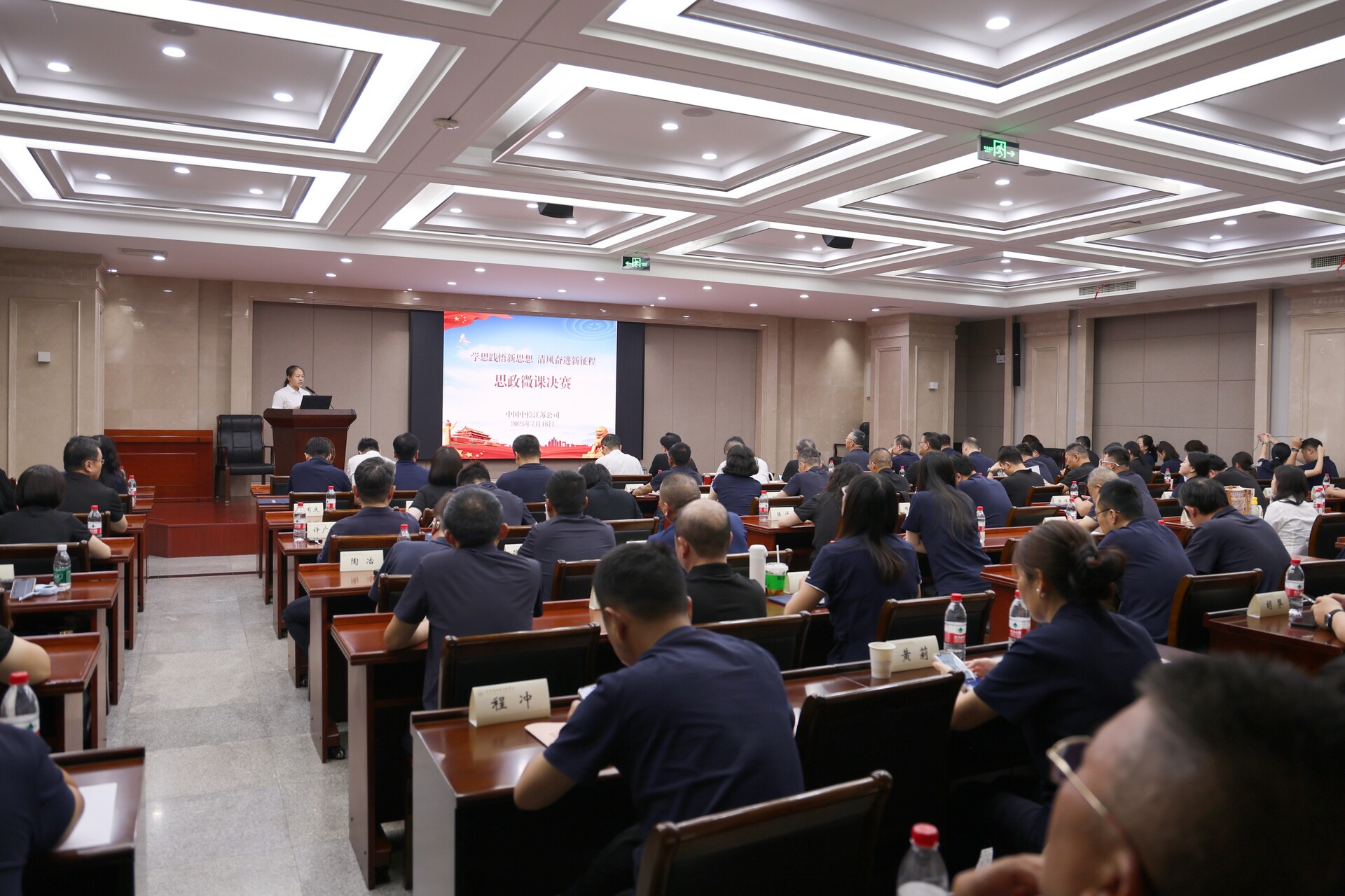 近日,中国中检江苏公司在党员轮训班暨党务干部履职能力培训班期间,举办了“学思践悟新思想 清风奋进新征程” 思政微课竞赛决赛。江苏公司领导班子成员马汉其、付军、李华、刘翔到会并担任此次竞赛的专家评委,全体轮训党员作为大众评委参与现场评分。