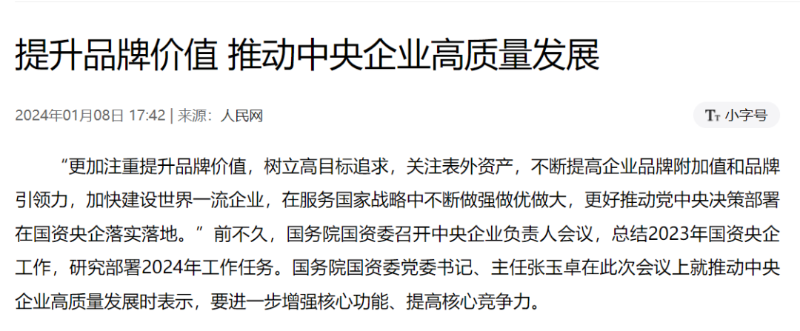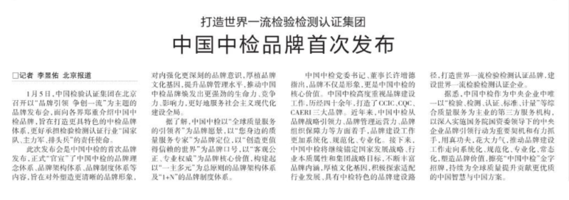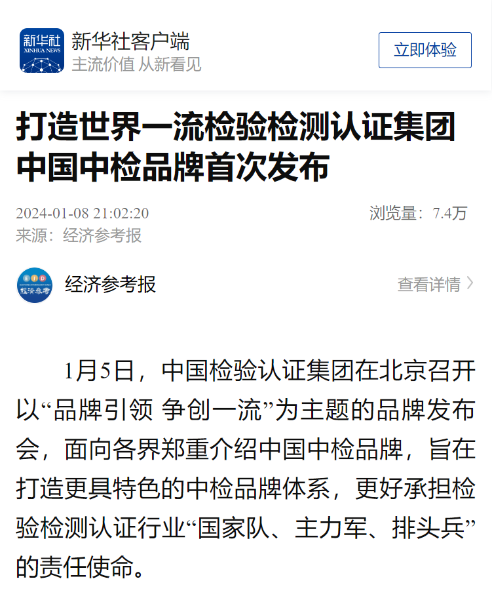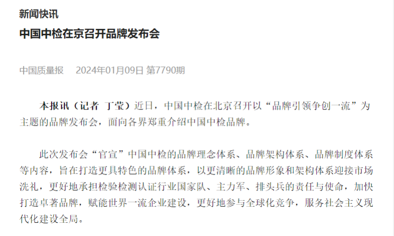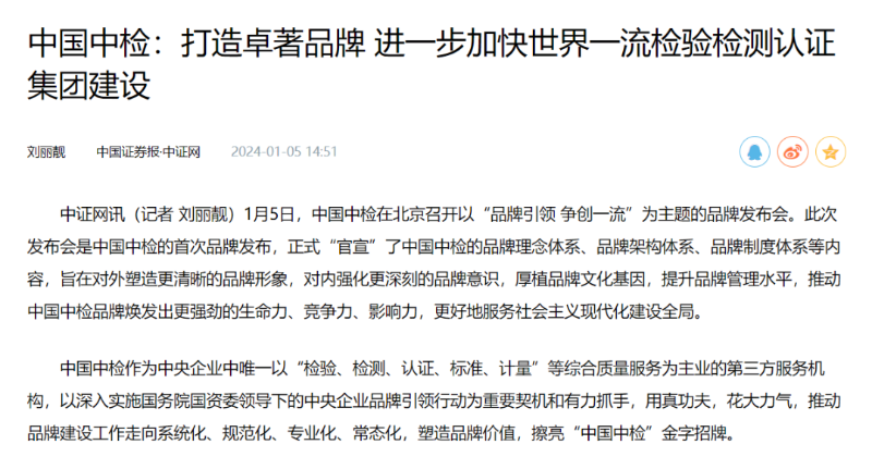 2024年1月5日,中国中检在北京召开以“品牌引领 争创一流”为主题的品牌发布会,面向各界郑重介绍中国中检品牌,“官宣”了中国中检的品牌理念体系、品牌架构体系、品牌制度体系等内容,旨在打造更具特色的中检品牌体系,更好地承担检验检测认证行业“国家队、主力军、排头兵”的责任使命。人民网、新华社客户端、经济参考报、中国证券报、中国质量报等媒体对此进行了报道。现将各媒体刊发情况展示如下: